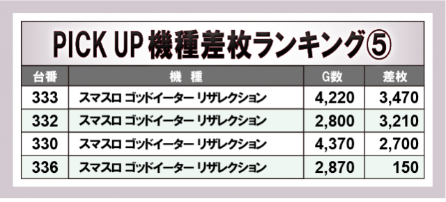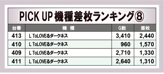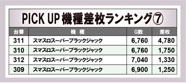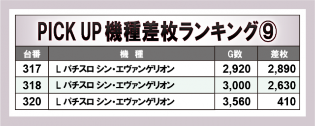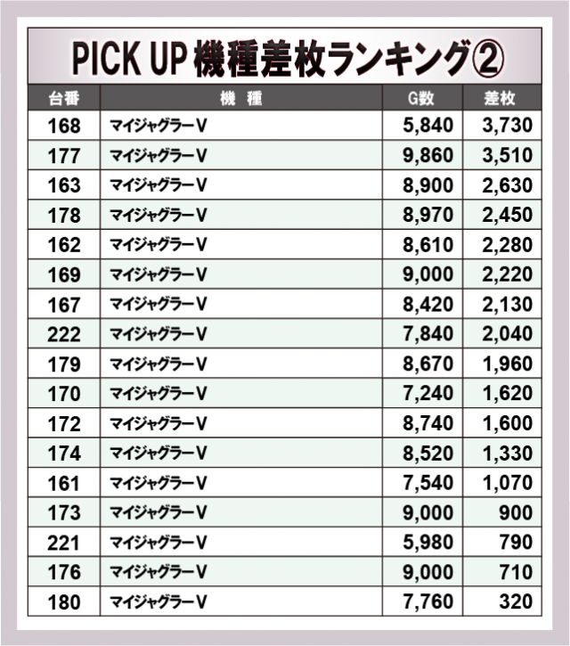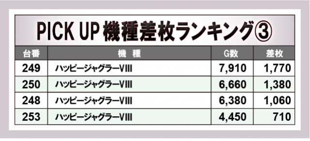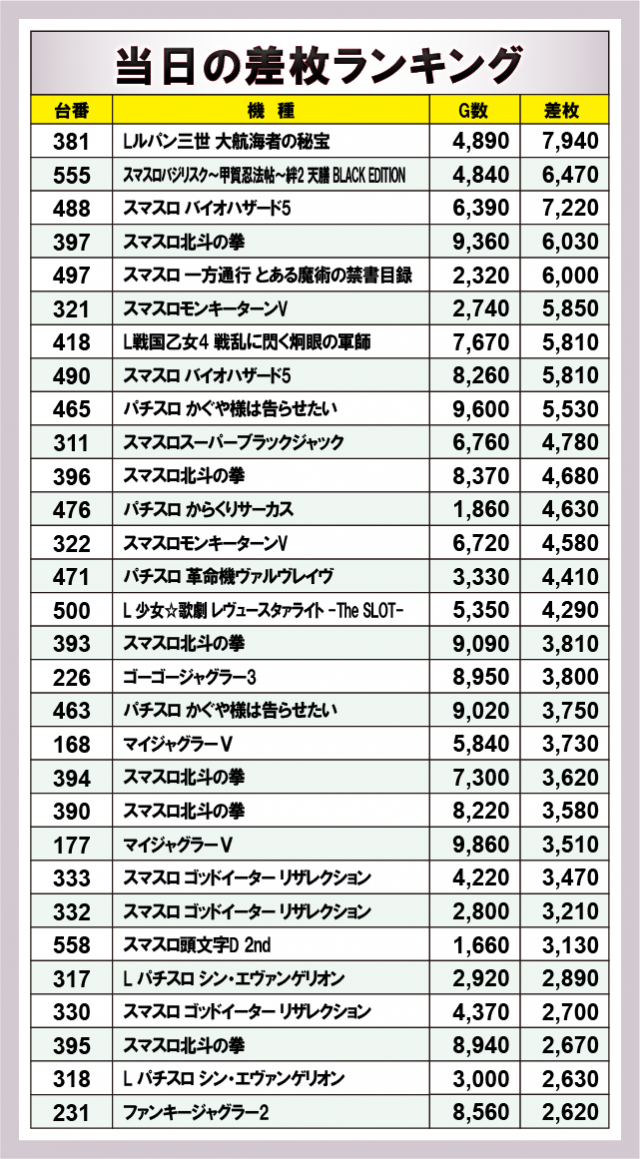 まずは当日の差枚ランキングを紹介。30台すべてが差枚+2,000枚オーバーで、+5,000枚オーバーは9台出現。それらのなかでもっとも優秀だった台は、381番台の「Lルパン三世 大航海者の秘宝」で、差枚は+7,940枚を獲得!その他ランクイン機種を見渡すと、「ジャグラー」シリーズも負け時とランクインしており、まさしく全館をあげて盛り上がりを作っていたと言えるだろう。