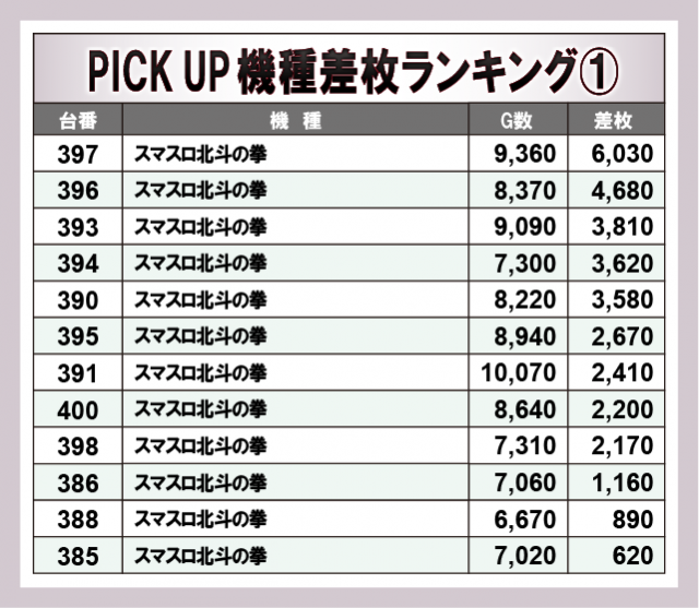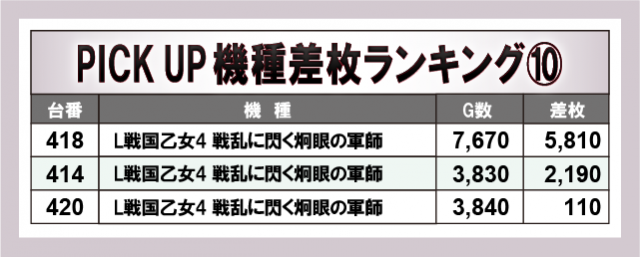 続いては、当日店内を大いに盛り上げた10機種をチェック。どの機種からも良台が多数出現していたが、その中で「マイジャグラーⅤ」は2,000枚オーバーが8台と熱気を放っており、存在感を大きくアピールしていた。もちろんAT機も奮起しており、「スマスロ北斗の拳」では万回転オーバー台もうまれ、じっくりと打ち込まれた形跡を確認できる。さらに「スマスロモンキーターンV」「L戦国乙女4 戦乱に閃く炯眼の軍師」といった既存の人気機種が活躍するばかりか、新台「スマスロ バイオハザード5」もさっそくポテンシャルを披露していたのが鮮烈だ。