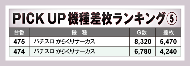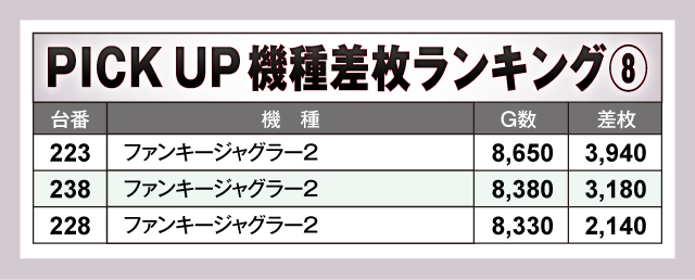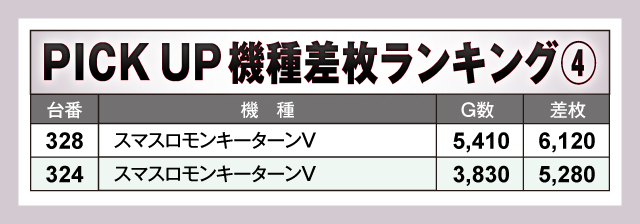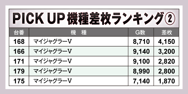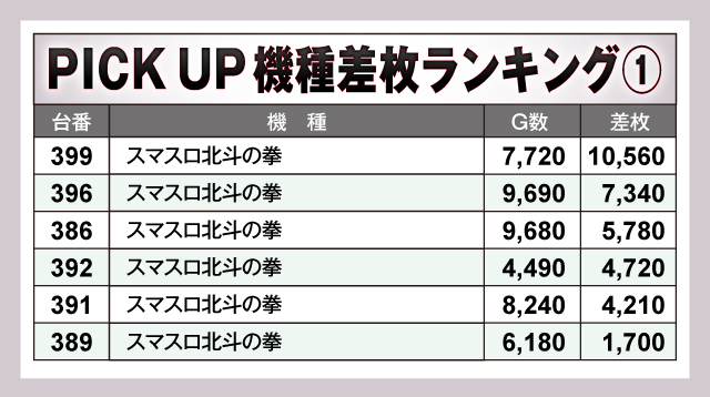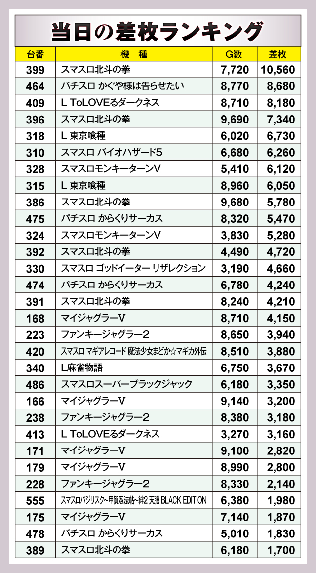 まずは差枚ランキングのチェックから。30台のうち23台が+3,000枚オーバーで、大台突破となる+5,000枚オーバーはなんと11台も出現。それらのなかでもっとも優秀だったのは、399番台の「スマスロ北斗の拳」で、差枚は+10,560枚で万枚オーバーを達成! その他ランクイン機種を見渡すと、スマスロが多くを占めるなか「マイジャグラーV」や「ファンキージャグラー2」などのノーマルタイプも複数台ランクイン! 多種多様な機種にチャンスが存在していたようだ!