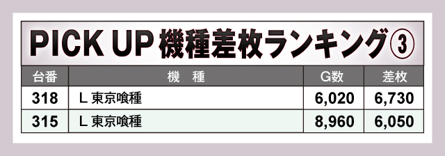 続いては、当日とくに盛り上がっていた8機種を紹介。いずれも素晴らしい結果を残していたが、なかでも「L 東京喰種」と「スマスロモンキーターンV」はそれぞれ2台とも+5,000枚オーバーと素晴らしい結果をマーク! 上記の機種たちを中心に、当日の盛り上がりを牽引していたのは間違いなさそうだ!