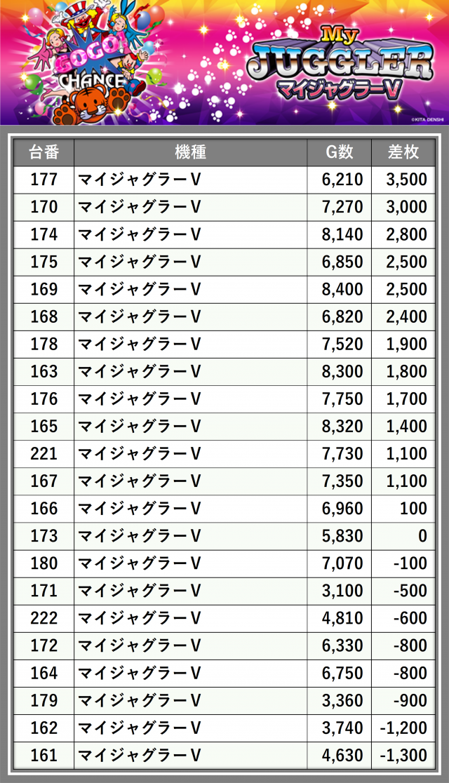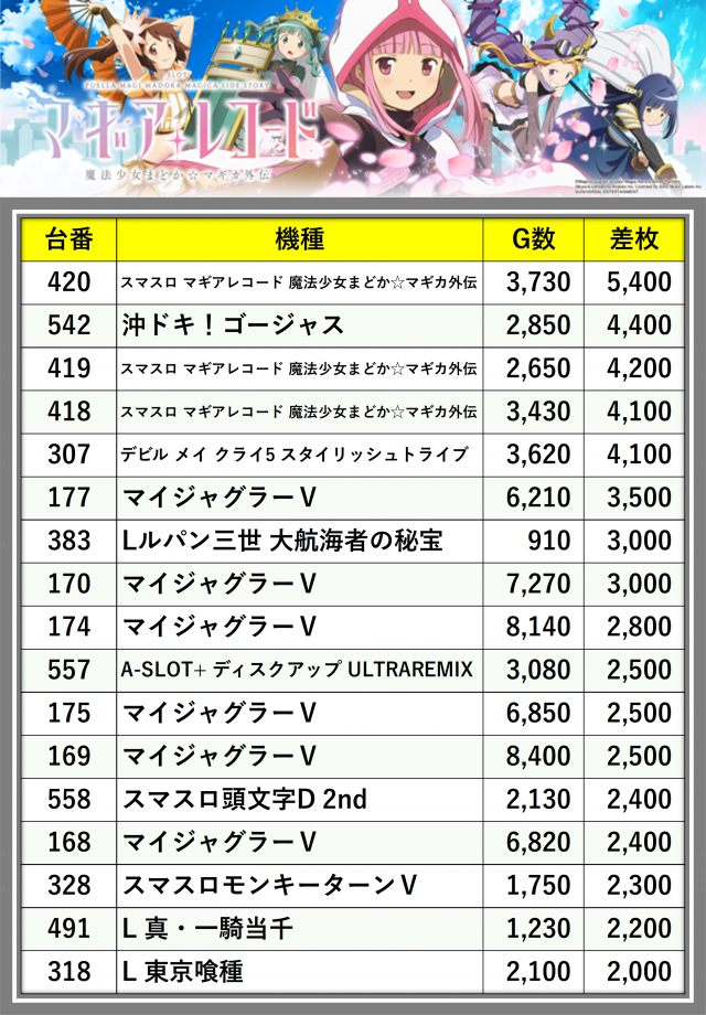 厳選された取材対象機種をはじめ、その他スロット全体から好記録が飛び出した!プレイヤーが楽しんだ1日を下記データにて振り返ってみて欲しい。