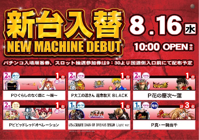 8/16(水)新台入替 パチンコ全6機種他導入!