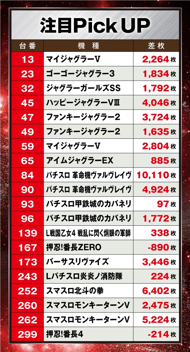 今回はスマスロやジャグラーシリーズから多くの好調台が誕生していた。次回降臨時は、ぜひあなたがチャンスを掴んでくれ!