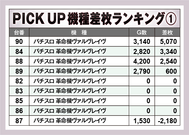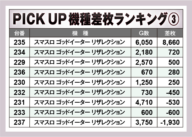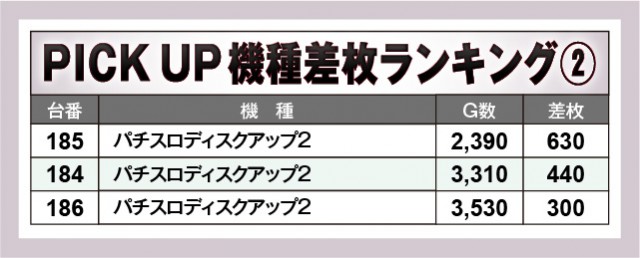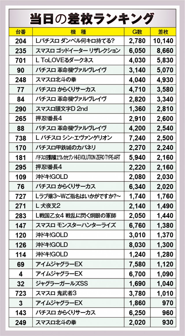 『パチスロディスクアップ2』は全台プラス差枚数を達成しており、その実力とポテンシャルを発揮していた。そして『パチスロ 革命機ヴァルヴレイヴ』『スマスロ ゴッドイーター リザレクション』は大台突破という熱気で盛り上げに貢献しており、マイナス台も少なくなっているのが特徴である。ファンはレバーオンに力が入っていたのは間違いなく、高みを目指そうとする姿勢に好感を覚えるばかりだ。
