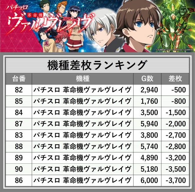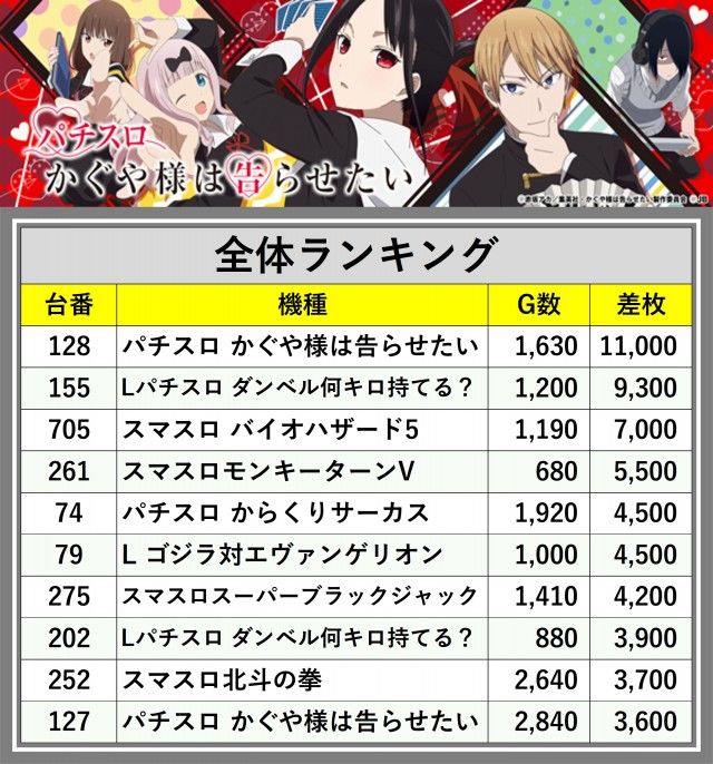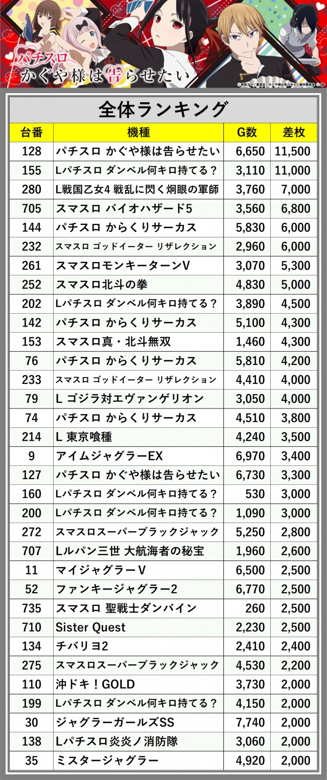 ※差枚数順に掲載しています