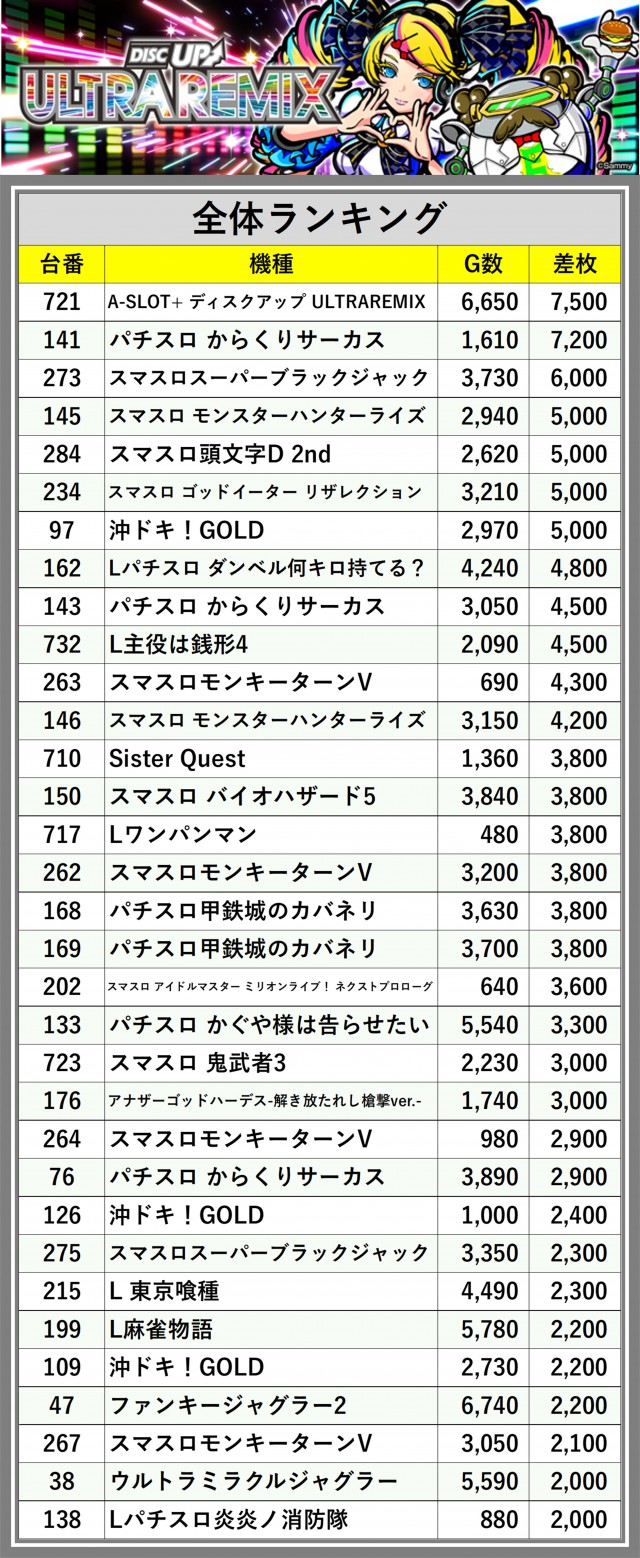 厳選された取材対象機種をはじめ、その他スロット全体から好記録が飛び出した!プレイヤーが楽しんだ1日を下記データにて振り返ってみて欲しい。