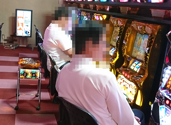 15時頃の20円パチスロでは、「ミリオンゴッド-神々の凱旋-」と「バジリスク~甲賀忍法帖~絆」が人気。機種の醍醐味を堪能できているようなプレイヤーが多く、華やかなムードも伝わってきた。