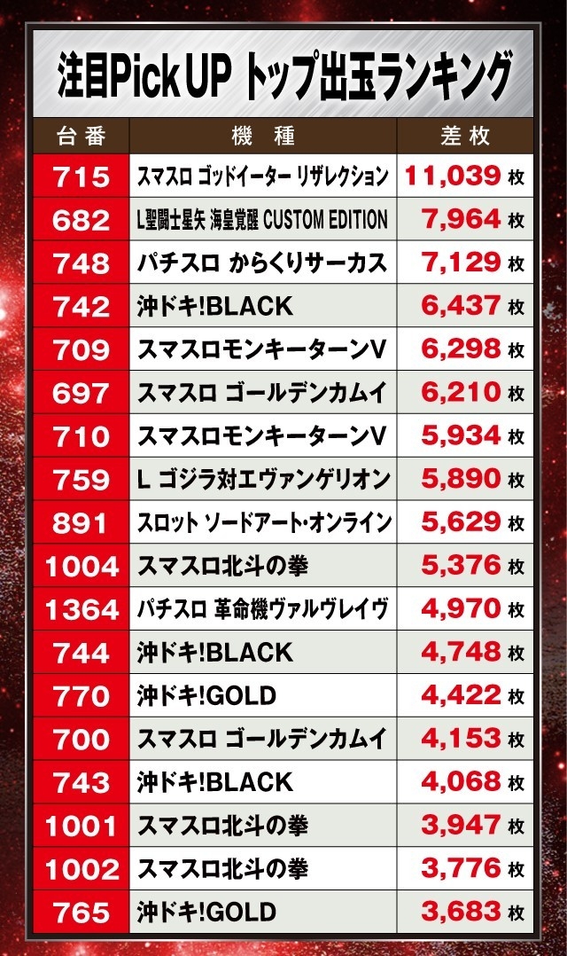 早速、店内の様子を見てみると『スマスロ ゴッドイーター リザレクション』が万枚超の+11,039枚を達成しランキングトップに、続く『L聖闘士星矢 海皇覚醒 CUSTOM EDITION』と『パチスロ からくりサーカス』も+7,000枚超を記録する見事な結果を残している。