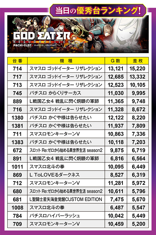まさかこの日のTOP3レコードを『スマスロ ゴッドイーター リザレクション』が独占するなど、誰に想像できただろうか。それも3台そろって10,000枚オーバーという破格の記録。さらに6位にもランクインしており、6台中4台が8,500枚超えという信じがたい記録を打ち立てることとなった。