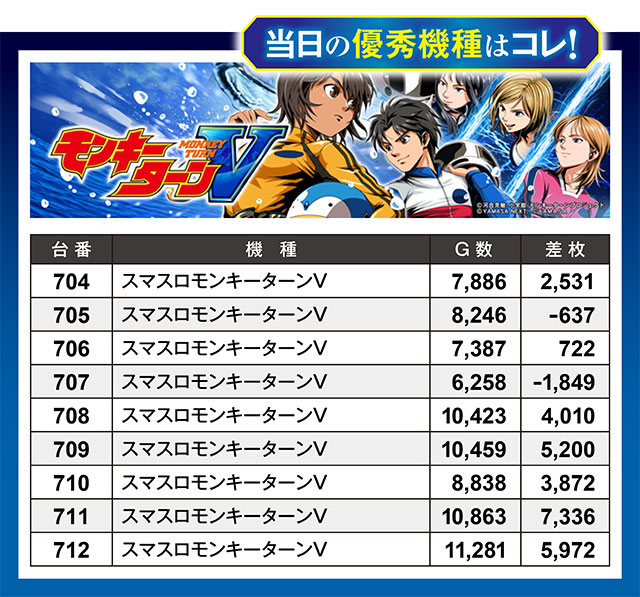 なんと9台中7台がプラス差枚という抜群の好環境だったばかりか、プラスの7台のうち5台が3,000枚を上回っていた『スマスロモンキーターンV』。明らかに他機種を圧倒する盛り上がりだったに違いない。