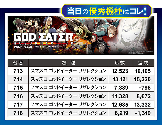 6台中4台が8,500枚オーバーという常識外れの結果を叩き出したのは『スマスロ ゴッドイーター リザレクション』。この日の差枚記録TOP3を独占し、この日一番の存在感を放っていた。それだけに、マイナスで終わった2台が偲びない…。