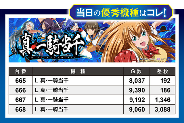 何気に全台プラスを達成していたのは『L 新・一騎当千』。3,000枚を超える記録こそ668番台のみだったが、全台がプラスになるにはそれ相当の環境だったということだろう。