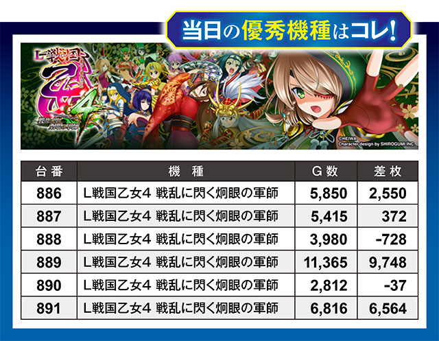 『L戦国乙女4 戦乱に閃く炯眼の軍師』は6台中4台がプラス差枚に。そして891番台が6,500枚超え、889番台が9,500枚超えというモンスターレコードを樹立!ここまで紹介してきた機種たち同様、チャンスが多かったことがうかがえる結果となった。