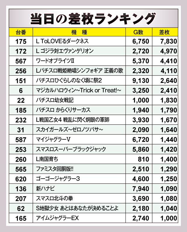 まずは差枚ランキングトップ30台のチェックから。19台のうち6台が+2,000枚オーバーを記録し、+4,000枚オーバーは4台出現! それらのなかでもっとも優秀だったのは、175番台の「L ToLOVEるダークネス」で、差枚は+7,830枚と素晴らしい記録をマーク! その他ランクイン機種には、「L ゴジラ対エヴァンゲリオン」や「ゴーゴージャグラー3」など、ファンから人気を集める機種を中心にチャンスがあったようだ!