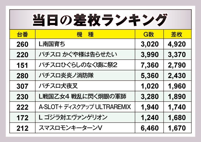 まずは差枚ランキングのチェックから。ランキング9台のうち4台が差枚+2,000枚オーバーを記録。それらのなかでもっとも優秀だったのは、260番台の「L南国育ち」で差枚は+4,920枚をマーク! その他にも、スマスロからメダル機まで多彩な機種がランクインしており、訪れたファンたちが存分に楽しめる環境が整っていたようだ!