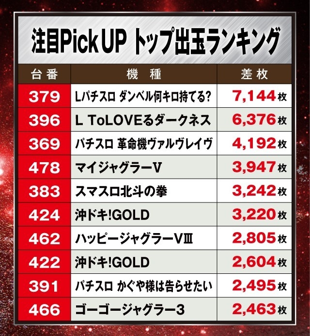 この日の店内状況をチェックすると『Lパチスロ ダンベル何キロ持てる?』が7,144枚を叩き出しランキングトップに、次いで『L ToLOVEるダークネス』が+6,376枚、『パチスロ 革命機ヴァルヴレイヴ』が+4,192枚と続き、新旧問わず人気のスマスロがランキング上位を独占した。