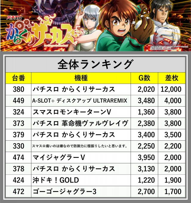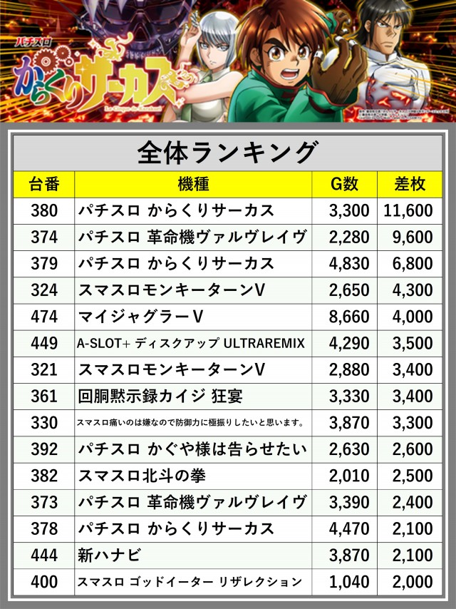 厳選された取材対象機種をはじめ、その他スロット全体から好記録が飛び出した!プレイヤーが楽しんだ1日を下記データにて振り返ってみて欲しい。
