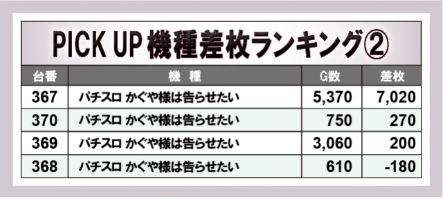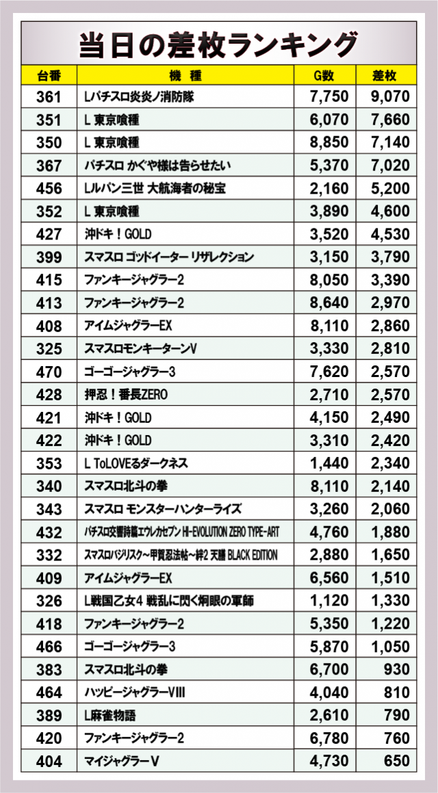 まずは差枚ランキングのチェックから。30台のうち19台が差枚+2,000枚オーバーを記録。そのうちの5台で差枚+5,000枚オーバーを記録し、もっとも優秀だったのは、361番台の「Lパチスロ炎炎ノ消防隊」で、差枚は+9,070枚を獲得! その他にも『ジャグラー』シリーズや『沖ドキ!GOLD』などのメダル機も数多くランクインし、店内全体にチャンスは存在していた!