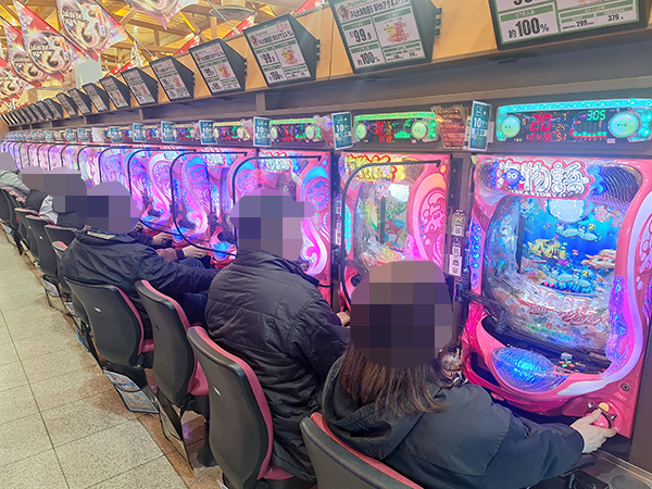 1000円/92枚・5.435円パチスロの支持も厚く、空き台が見当たらないほどの盛況ぶりだった。