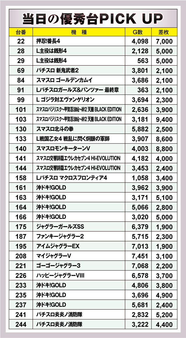 まずは優秀台30台の紹介から。30台のうち28台が+2,000枚オーバーで、+5,000枚オーバーは9台出現。それらのなかでもっとも優秀な成績を収めたのが、103番台の「スマスロバジリスク~甲賀忍法帖~絆2 天膳 BLACK EDITION」で、差枚+9,400枚を獲得!またランクイン台を詳しく見てみると、スマスロが活躍を見せるなか「沖ドキ!GOLD」やジャグラーシリーズなど、幅広い機種から好記録が多数確認できた。
