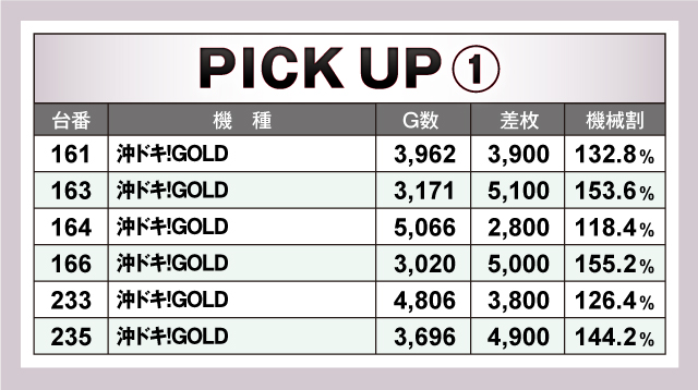 続いては、優秀台30台のなかでもっとも多い7台がランクインした「沖ドキ!GOLD」を紹介していこう。今回ピックアップしたのは6台で、そのうち3台が差枚約+5,000枚の超記録をマークし、6台すべてが4ケタオーバーのプラスを量産! そして平均差枚も+4,250枚と素晴らしい結果を残していた!
