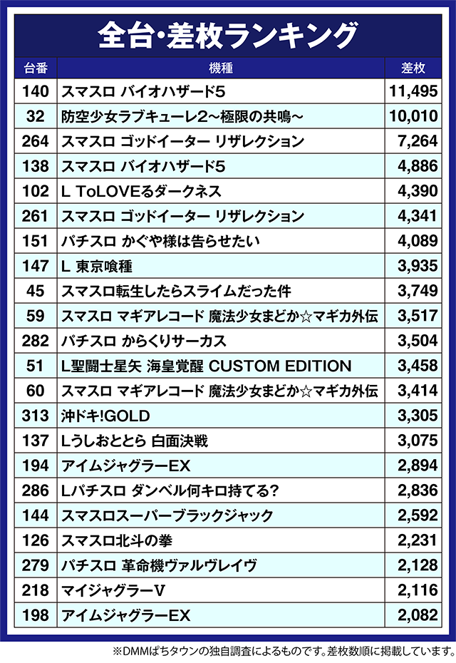 「スマスロ ゴッドイーター リザレクション」の264番台は7,264pt、「L ToLOVEるダークネス」の102番台も4,390ptと、数多の台が結果を残した。