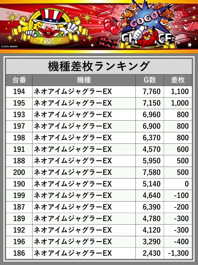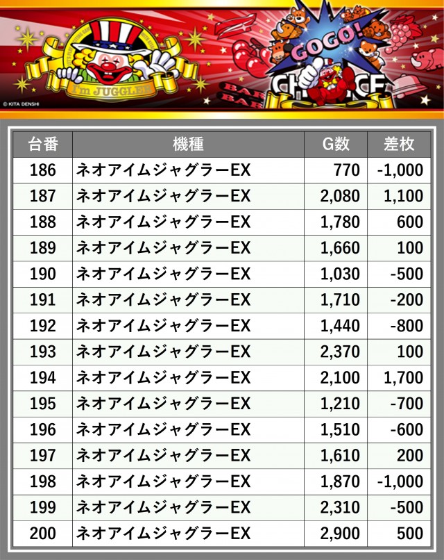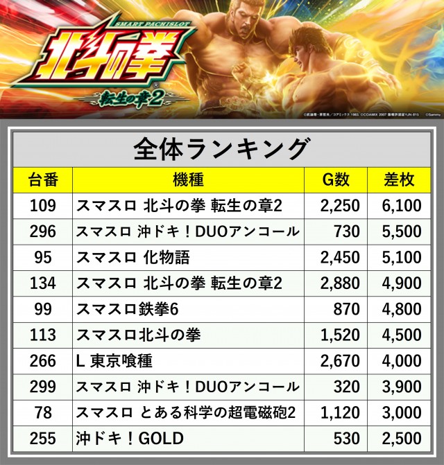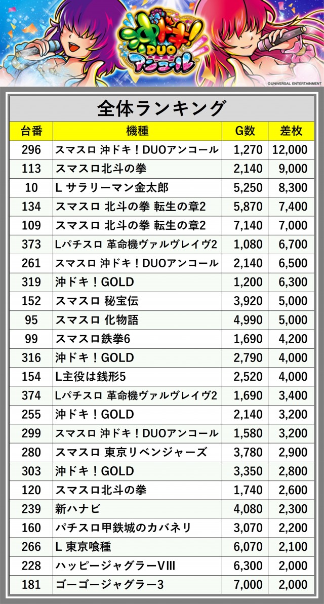 厳選された取材対象機種をはじめ、その他スロット全体から好記録が飛び出した!プレイヤーが楽しんだ1日を下記データにて振り返ってみて欲しい。