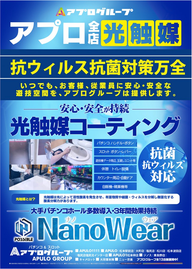 パチンコのハンドルやパチスロのレバーだけでなく、店内中のいたるところにコーティングを施し、安心安全の遊技環境を作り出している。