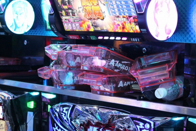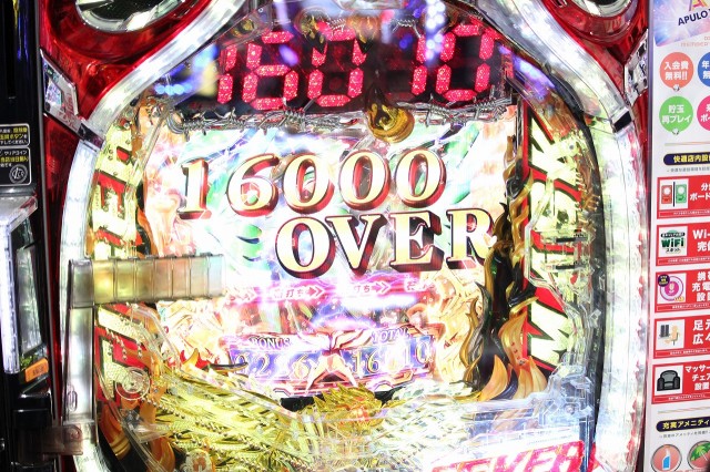 朝から変わらぬフル稼働を魅せる『沖海4』や『牙狼』、『ルパン』を筆頭に、真っ赤な玉箱で作られた《アプロ》製の“北アルプス”が築かれている!