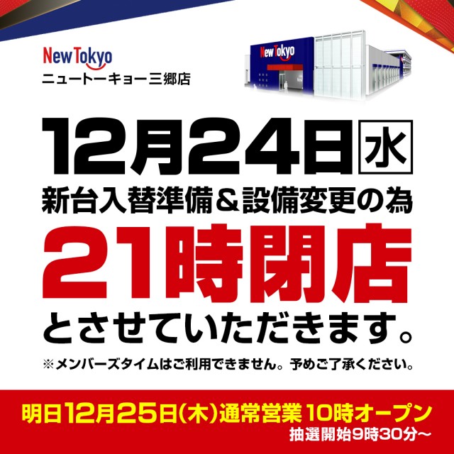 新台入替準備・設備変更の為【21時閉店】とさせて頂きます。