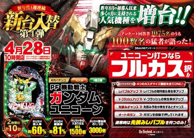 箕アサ4.28新台入替ガンダムUCまたまた増台!!