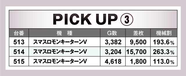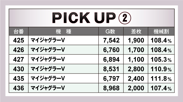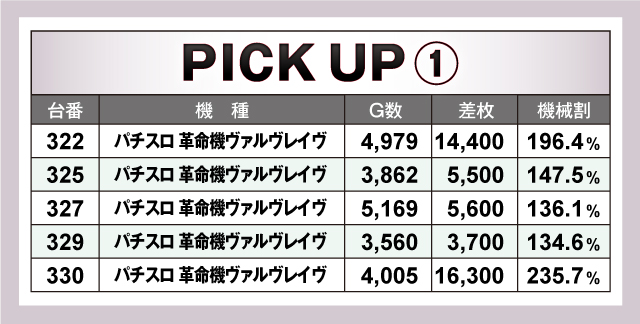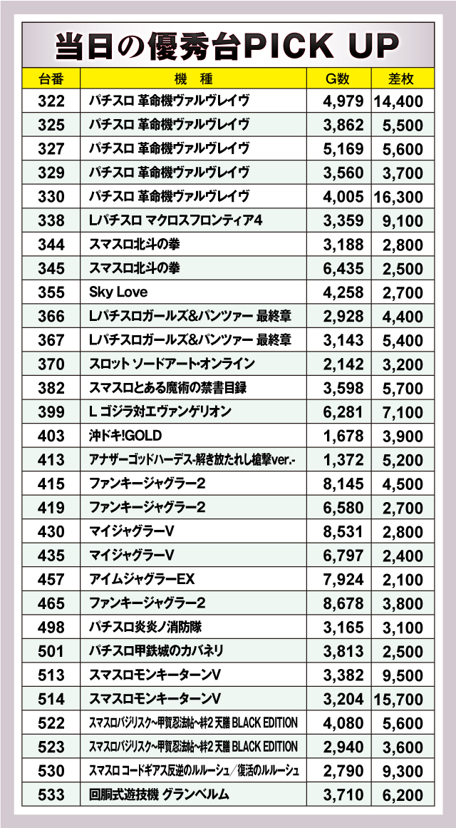 続いては、当日とくに盛り上がりを見せた3機種を紹介していこう。「パチスロ 革命機ヴァルヴレイヴ」「マイジャグラーV」「スマスロモンキーターンV」それぞれピックアップ台のトータルはプラスで、それらのなかでも「パチスロ 革命機ヴァルヴレイヴ」は、最優秀台の330番台を筆頭に平均差枚+9,100枚の超絶記録をマーク! 当日、これらの機種が店内を盛り上げた機種で間違いないだろう!