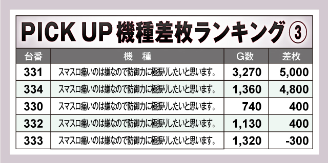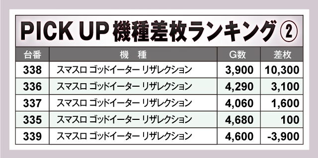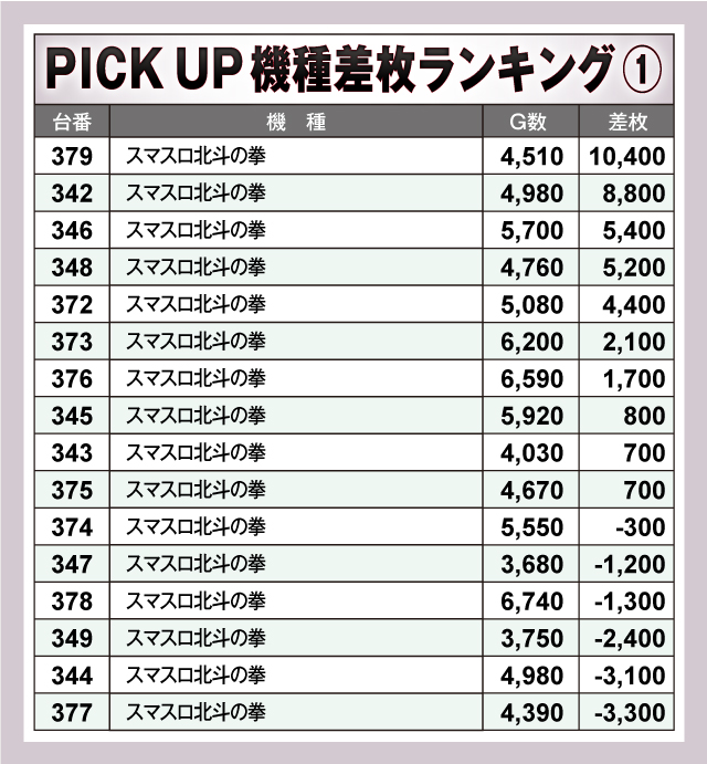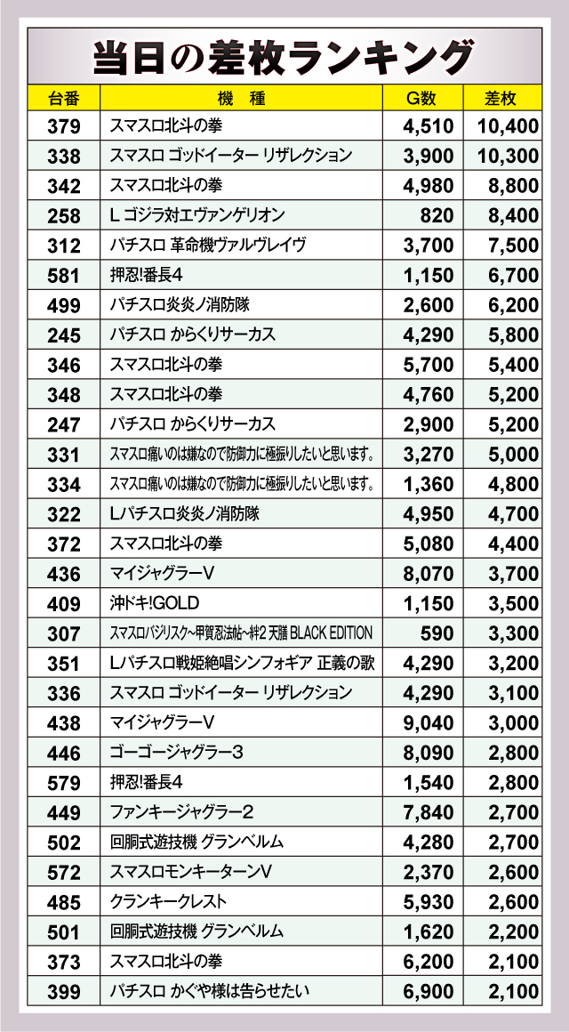 まずは優秀台30台のチェックから。30台すべてが+2,000枚オーバーを記録し、+3,000枚オーバーは21台出現! それらのなかでもっとも優秀だったのは、379番台の「スマスロ北斗の拳」で、差枚は+10,400枚と素晴らしい記録をマーク! その他ランクイン機種には、人気スマスロ機種をはじめジャグラーシリーズや最新機種など、店内のあらゆる機種にチャンスがあったようだ!
