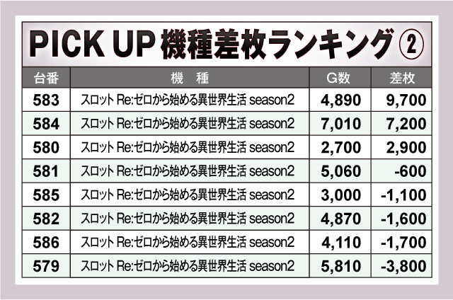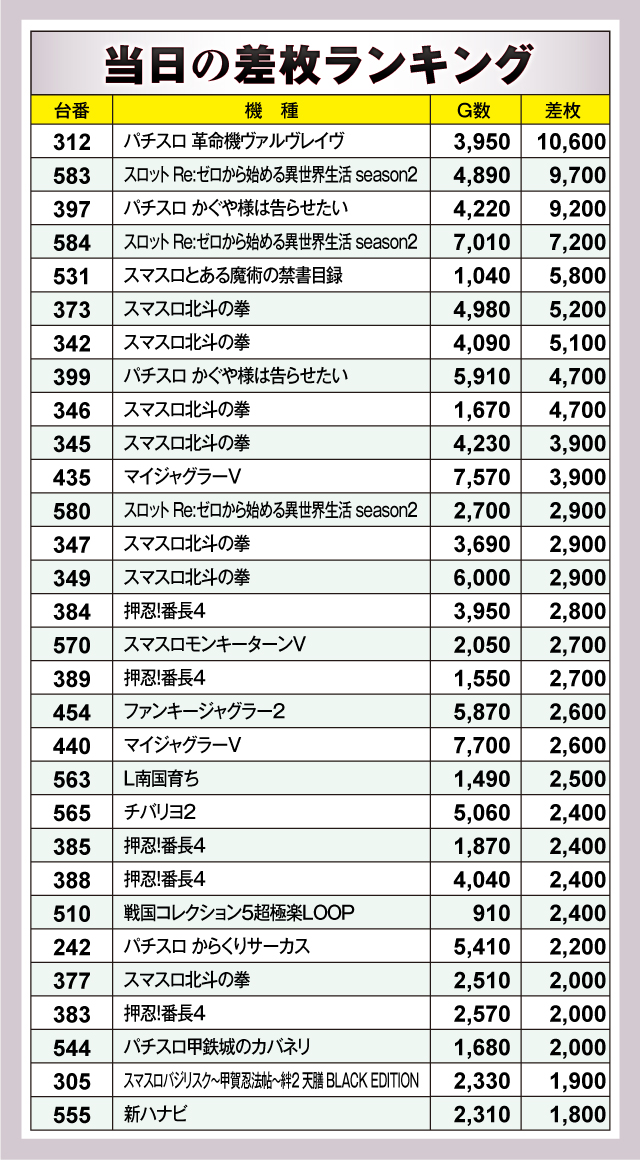 まずは優秀台30台のチェックから。30台のうち28台が+2,000枚オーバーを記録し、+3,000枚オーバーは11台出現! それらのなかでもっとも優秀だったのは、312番台の「パチスロ 革命機ヴァルヴレイヴ」で、差枚は大台突破の+10,600枚と素晴らしい記録をマーク! その他「スマスロ北斗の拳」などの人気スマスロ機種をはじめ、ジャグラーシリーズや少数設置機種などがランクイン。店内全体にチャンスがあったようだ!