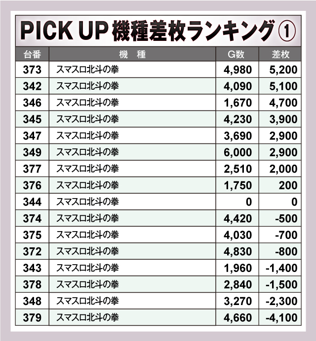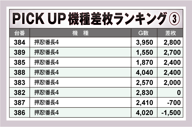 続いては、当日とくに盛り上がっていた3機種を紹介。3機種ともトータルプラスで終了しており、とくに「スマスロ北斗の拳」はピックアップ16台のうち7台が+2,000枚オーバーのプラス! 続いて「押忍!番長4」は5/8台が+2,000枚オーバーとこちらも素晴らしい成績を残していた!