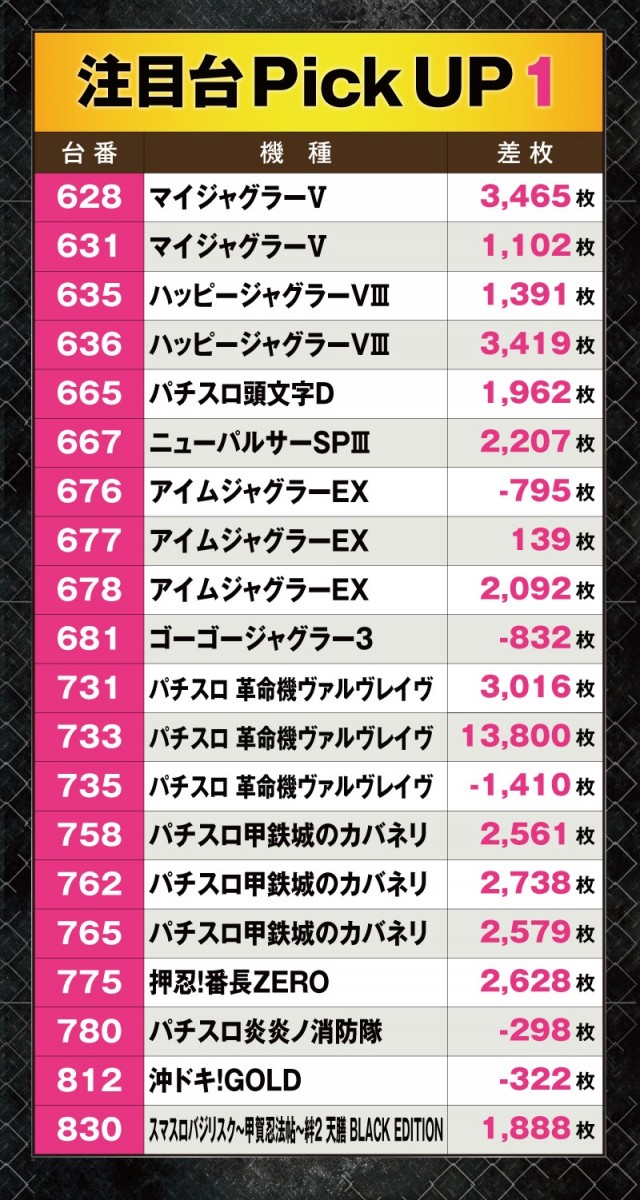 ほかにはジャグラーシリーズから多数の好調台を確認。『マイジャグラーⅤ』や『ハッピージャグラーVⅢ』は3,000枚オーバーと機種のポテンシャルを上手く引き出している。