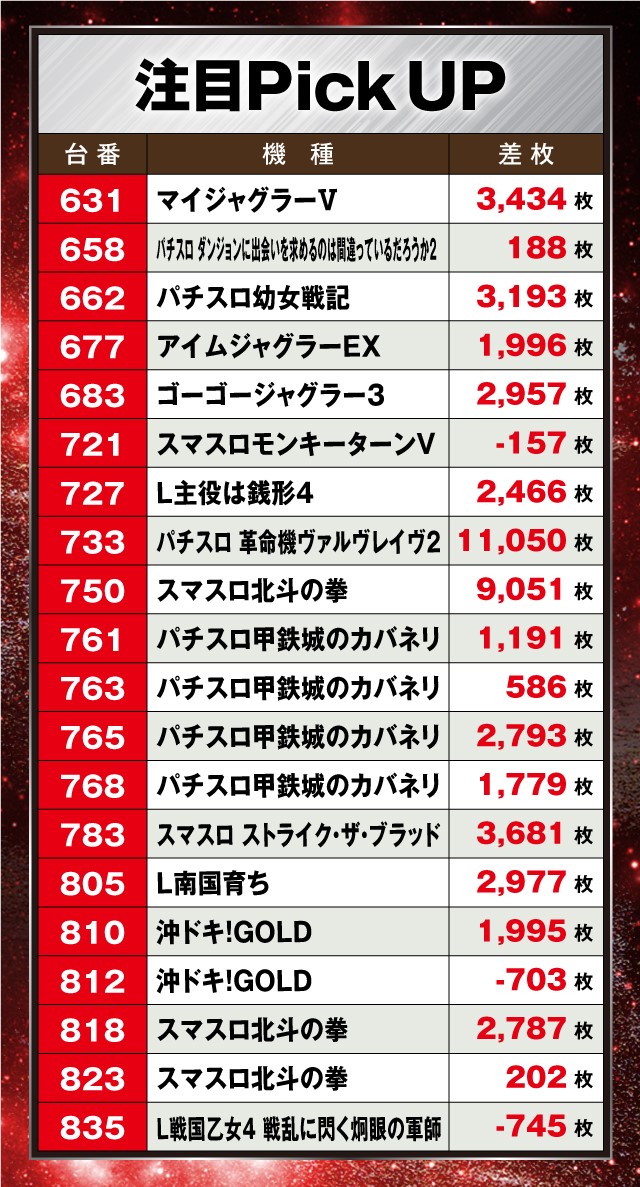 さらに『スマスロ北斗の拳』をはじめ、『マイジャグラーⅤ』『パチスロ幼女戦記』『スマスロ ストライク・ザ・ブラッド』など活躍する好調台が多く、プレイヤーたちは納得の表情を浮かべていた。