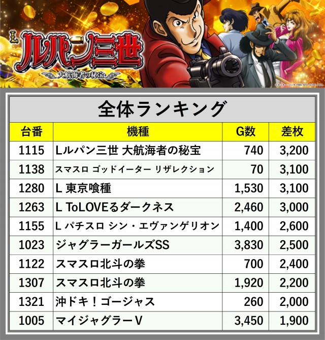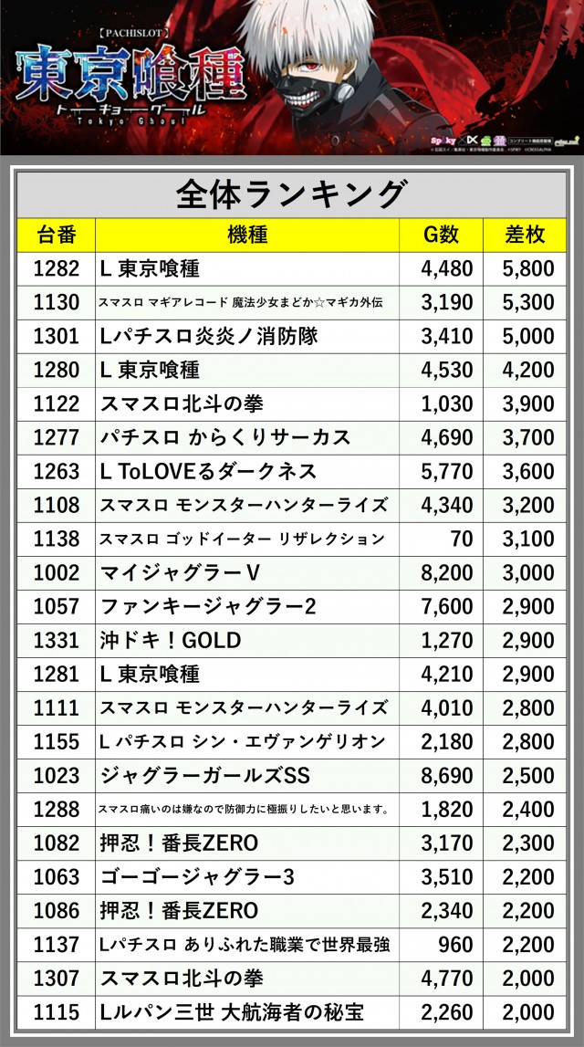 厳選された取材対象機種をはじめ、その他スロット全体から好記録が飛び出した!プレイヤーが楽しんだ1日を下記データにて振り返ってみて欲しい。