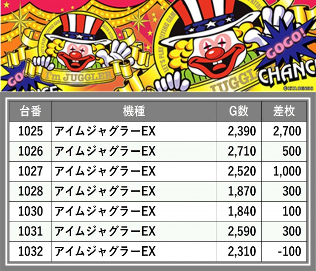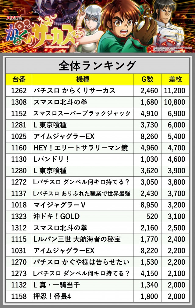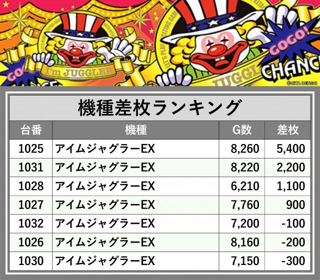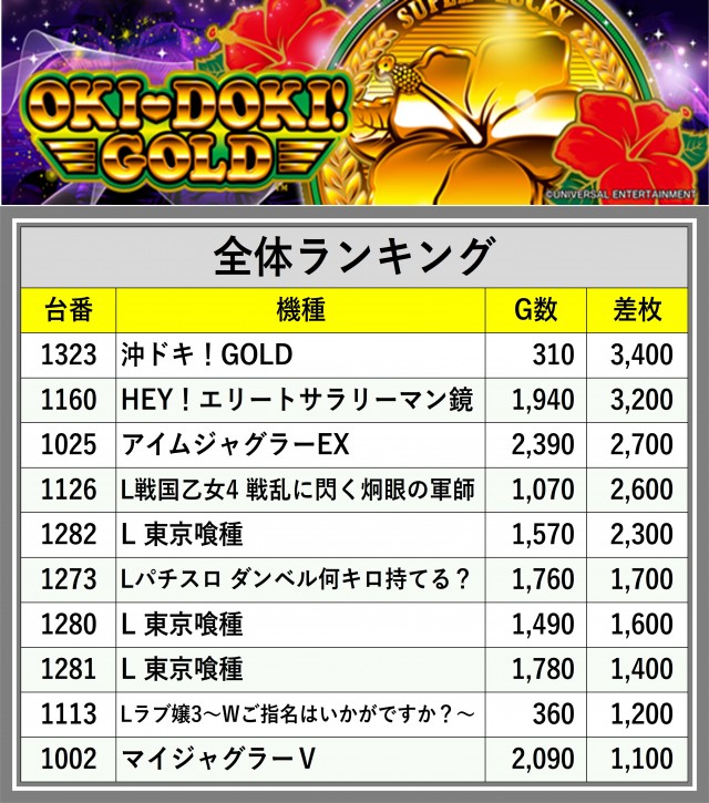 厳選された取材対象機種をはじめ、その他スロット全体から好記録が飛び出した!プレイヤーが楽しんだ1日を下記データにて振り返ってみて欲しい。