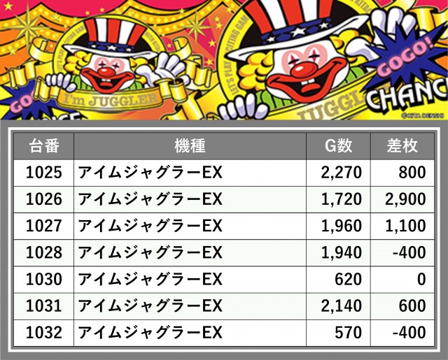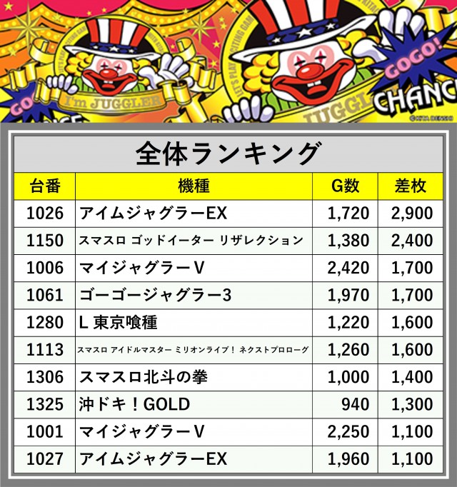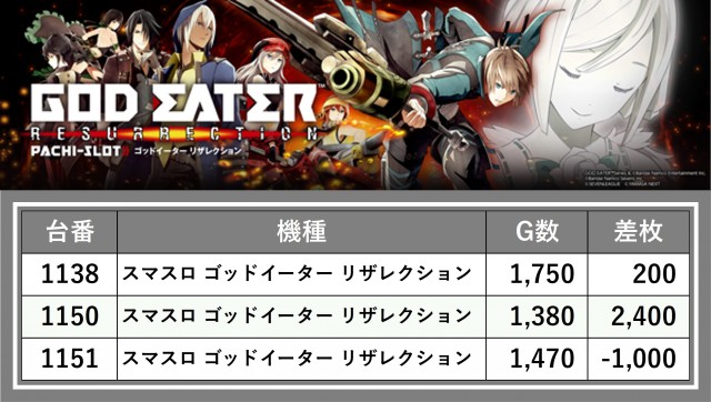 厳選された取材対象機種をはじめ、その他スロット全体から好記録が飛び出した!プレイヤーが楽しんだ1日を下記データにて振り返ってみて欲しい。