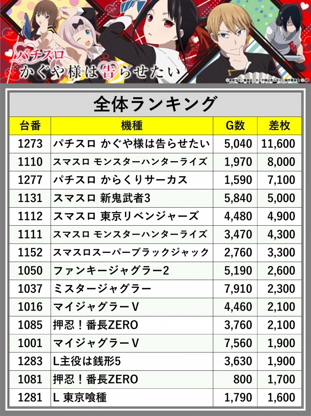 厳選された取材対象機種をはじめ、その他スロット全体から好記録が飛び出した!プレイヤーが楽しんだ1日を下記データにて振り返ってみて欲しい。