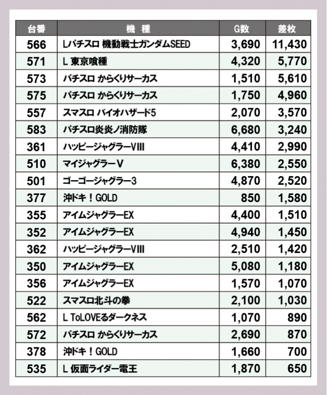 機種別差枚ランキング