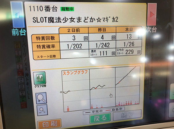 今回のアッパーは、キングイーグルズ佐世保針尾店の1110番台【SLOT魔法少女まどか☆マギカ2】と