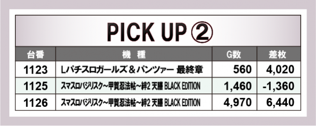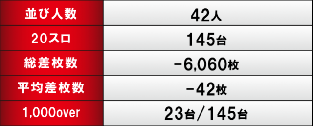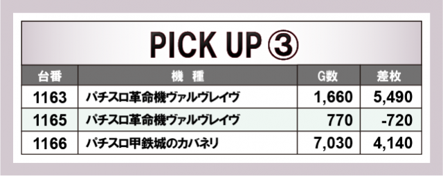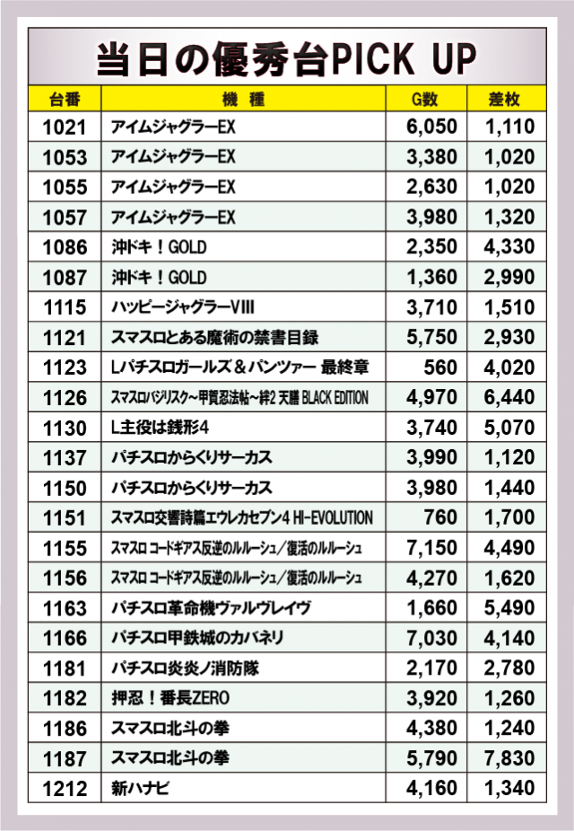 優秀台に目を通してみると、『スマスロ北斗の拳』1187番台+7,830枚、『スマスロバジリスク~甲賀忍法帖~絆2 天膳 BLACK EDITION』1126番台+6,440枚、『L主役は銭形4』1130番台+5,070枚、『パチスロ革命機ヴァルヴレイヴ』1163番台+5,490枚など大台突破台を確認できるばかりか、終日を通して打ち込まれていた様子が目に見えて分かることから、ポテンシャルを秘めた台が多数あったのは間違いない。