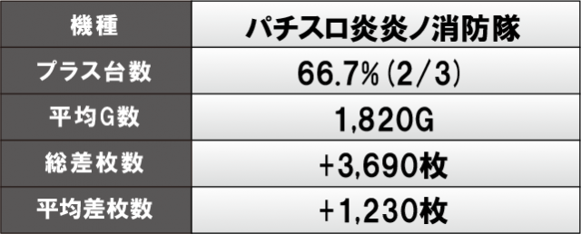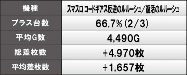 機種単位での活躍を見ると、『スマスロ北斗の拳』『スマスロ コードギアス反逆のルルーシュ/復活のルルーシュ』『パチスロ炎炎ノ消防隊』は平均差枚数4桁OVERを記録しており、各所でまとまった出玉を獲得していた様子が窺える。