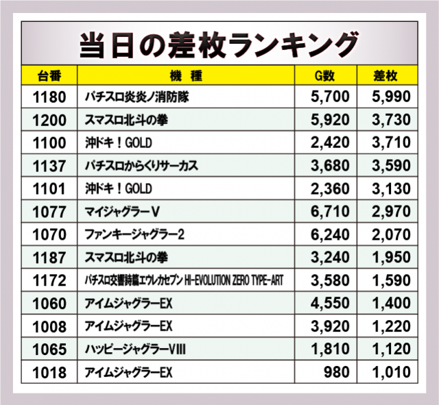 『パチスロ炎炎ノ消防隊』から+5,000枚OVERが発生。さらに、『スマスロ北斗の拳』『沖ドキ!GOLD』『パチスロからくりサーカス』から+3,000枚OVERをマークするなど、人気スマスロ機からメダル機まで幅広い機種にチャンスがあったことが窺える。