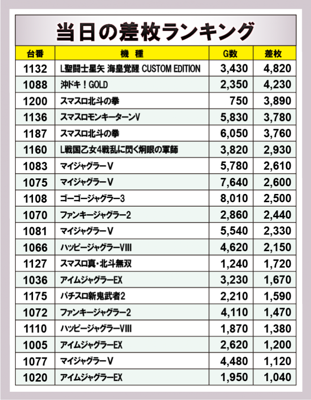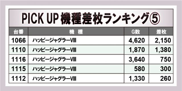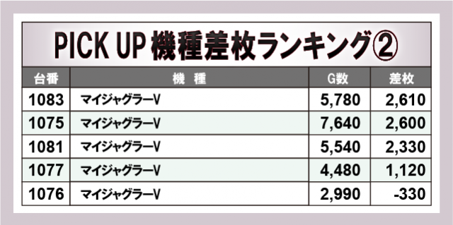 上表の5機種が盛り上がりを牽引し、活気と熱気を放ってファンを歓喜させていた。なかでも『マイジャグラーⅤ』は+2,000枚OVERが3台出現し、館内の盛り上がりに大きく貢献していたと言えるだろう。