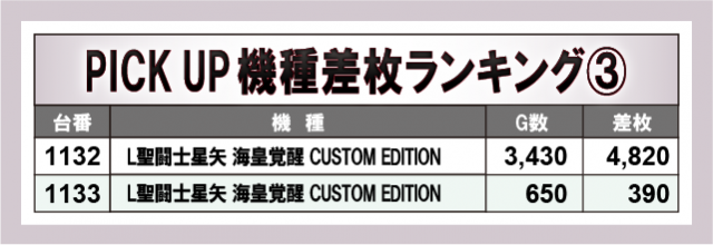 『L聖闘士星矢 海皇覚醒 CUSTOM EDITION』『沖ドキ!GOLD』から+4,000枚OVERが発生。次いで、『スマスロ北斗の拳』『スマスロモンキーターンV』から+3,000枚OVERをマークするなど、定番人気機種からメダル機まで幅広い機種にチャンスがあったことが窺える。