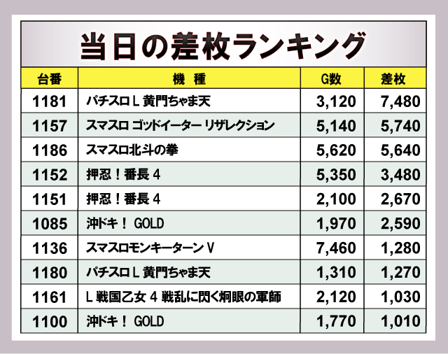 差枚ランキングをチェックしてみると、この日最も優秀だったのは、『パチスロL黄門ちゃま天』で+7,000枚OVERをマーク。さらに、『スマスロ ゴッドイーター リザレクション』『スマスロ北斗の拳』で+5,000枚OVER達成!様々な機種からまとまった出玉を獲得しており、遊技するファンは笑顔をこぼしていたに違いない。