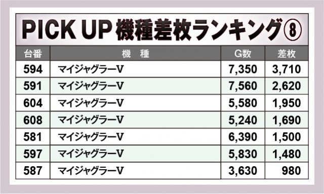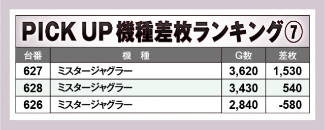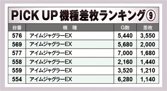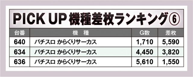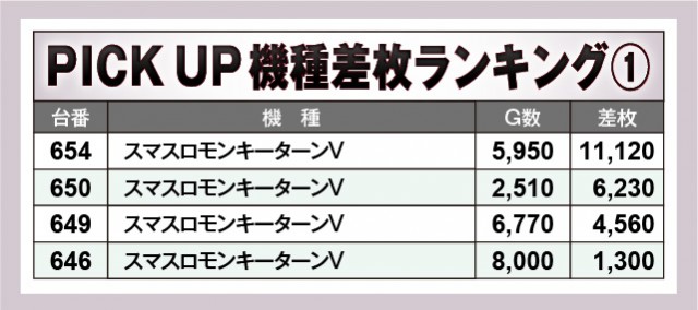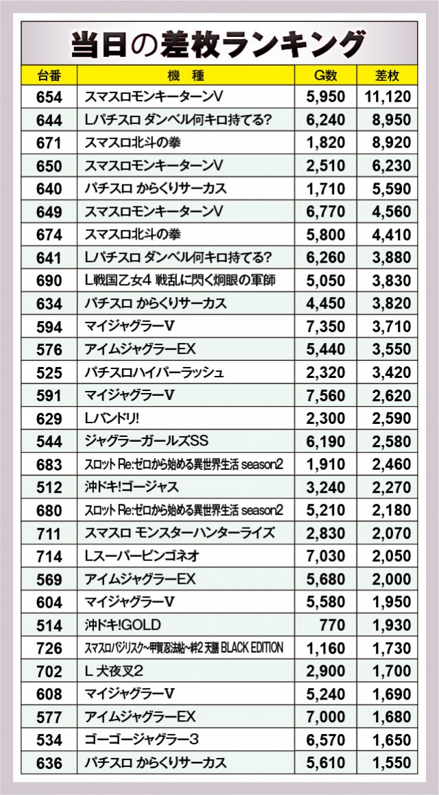 9機種が優秀機種として活躍しており、そのいずれもがコンスタントな大当りを披露していたようだ。万枚OVERを達成した『スマスロモンキーターンV』は言わずもがな、新台としてデビューしたばかりの『Lパチスロ ダンベル何キロ持てる?』、大台突破の『パチスロ からくりサーカス』など、高い熱気を放っていたのが目に焼きつく。もちろん『ジャグラー』シリーズも奮闘しており、館内各所に可能性が眠っていたと分かる。